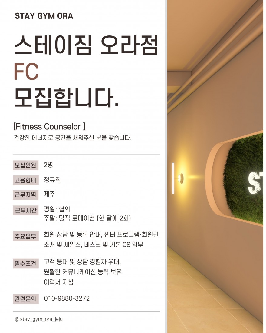 BK 스테이컴퍼니 "스테이짐 오라점"에서 함께 할 FC 인재를 찾습니다.