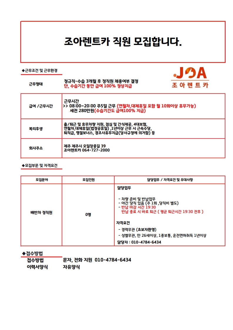✧*.◟(ˊᗨˋ)◞.*✧ 조아렌트카 / 출퇴근,휴무차량지원 / 배차 정직원 페이지 정보 작성자 쎄OO어 작성일25-10-09 17:13 조회300회 연락처 010-4784-6434 급여 월급 : 280만원 관련링크 본문 주소 : 제주특별자치도 제주시 오일장중길 39 조아렌트카 이전글 다음글 목록