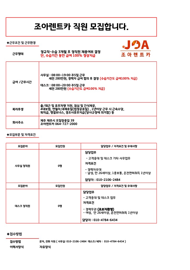 조아렌트카) 데스크,사무실 직원을 모집합니다. / 출퇴근 및 휴무차량 지원 페이지 정보 작성자 jOOOOa 작성일24-05-13 09:12 조회8,439회 연락처 010-4784-6434 급여 월급 : 280만원 관련링크 본문 . 주소 : 제주특별자치도 제주시 오일장중길 39 조아렌트카 이전글 다음글 목록
