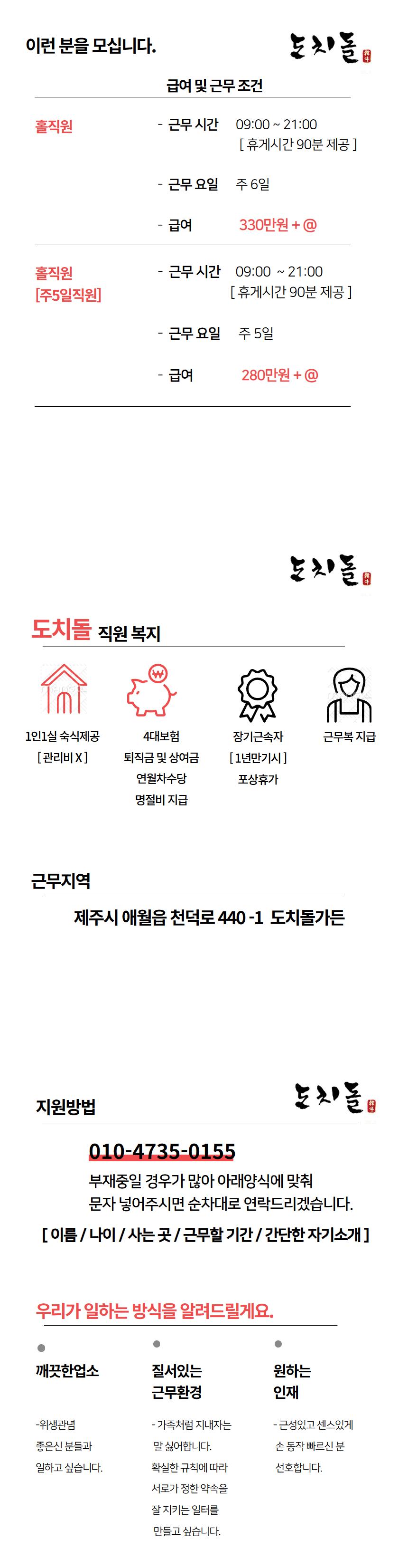 [숙식제공/1인1실]_280,330만원_홀직원_모집 페이지 정보 작성자 gOOOOOOOOO8 작성일25-09-28 06:59 조회521회 연락처 010-4735-0155 급여 월급 : 330만원 관련링크 본문 . 주소 : 천덕로440-1 이전글 다음글 목록