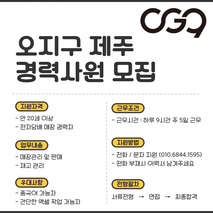 ❤️❤️ 오지구와 함께 재밌게 일할 정직원 모집합니다 ❤️❤️ 페이지 정보 작성자 오OOO주 작성일25-12-28 18:17 조회123회 연락처 010-6844-1595 급여 월급 : 270만원 관련링크 본문 전화 / 문자 지원 부탁드립니다전화 부재시 문자로 이력서 남겨주시면 빠르게 회신 드리겠습니다 !! 주소 : 제주특별자치도 제주시 노연로 30 에코빌리지 1층 OG9 전자담배 이전글 다음글 목록