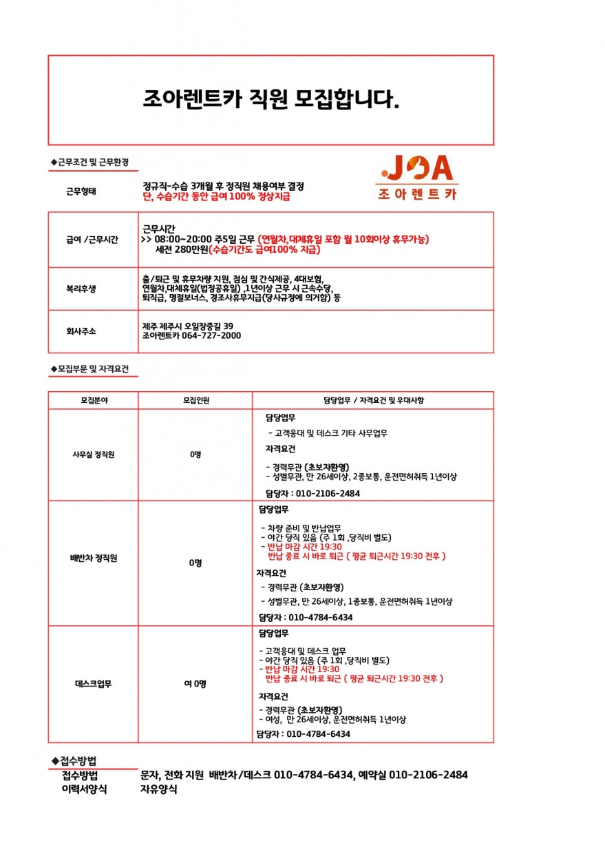 ❤️ᕕ( ᐛ )ᕗ조아렌트카❤️예약실 데스크 배차 / 출퇴근 휴무 차량 지원 페이지 정보 작성자 jOOOOa 작성일25-12-16 09:00 조회133회 연락처 010-4784-6434 급여 월급 : 280만원 관련링크 본문 주소 : 제주특별자치도 제주시 오일장중길 39 조아렌트카 이전글 다음글 목록