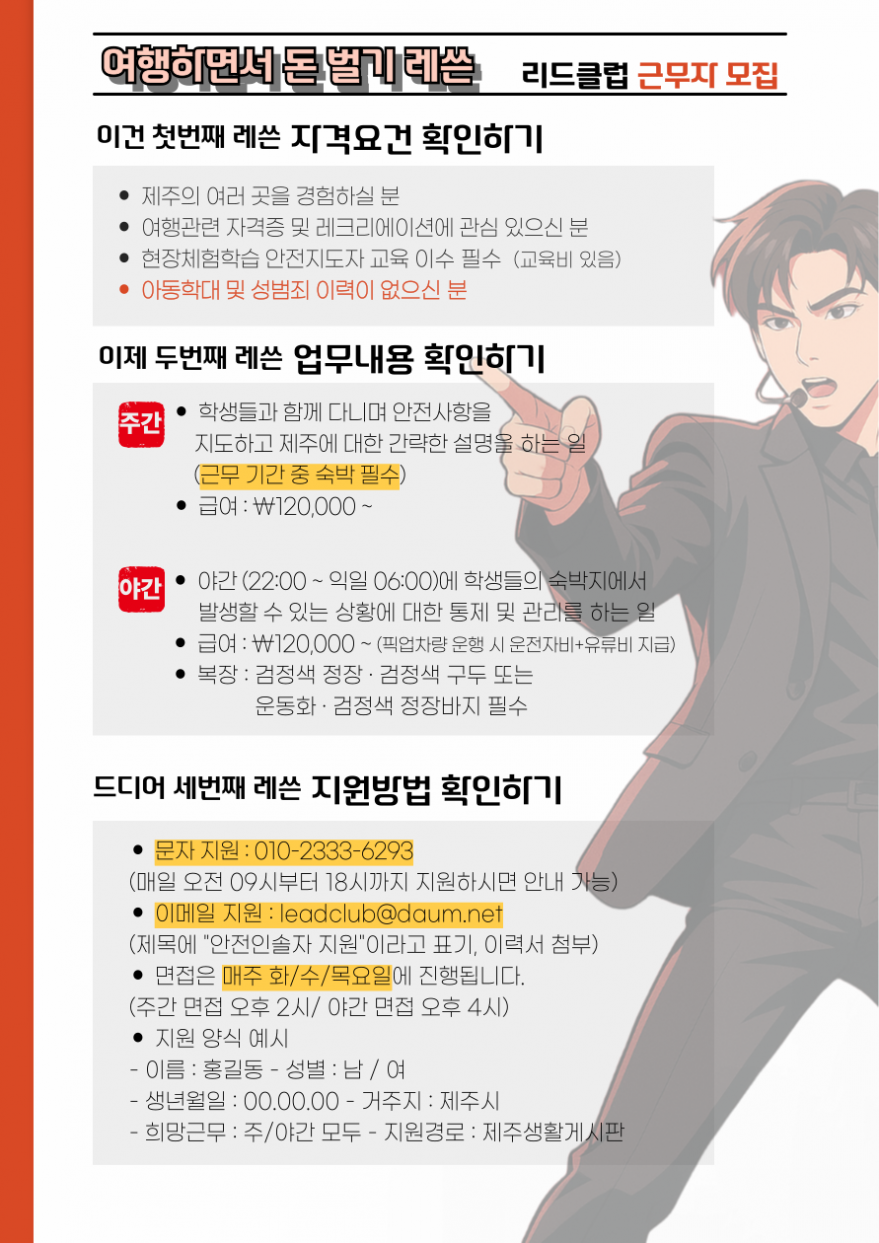 ☆제주_수학_여행_인솔자_근무자구인☆!!!& 페이지 정보 작성자 차OO만 작성일25-09-28 18:00 조회88회 연락처 010-5227-3021 급여 일당 : 130,000 관련링크 본문 주소 : 노연로 55 4층 이전글 다음글 목록
