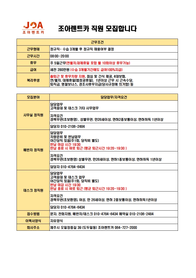 ⭐໒(◉ᴥ◉)७조아렌트카 / 예약실데스크배차 / 출퇴근휴무차량지원 페이지 정보 작성자 jOOOOa 작성일25-12-20 09:20 조회86회 연락처 010-4784-6434 급여 월급 : 280만원 관련링크 본문 주소 : 제주특별자치도 제주시 오일장중길 39 조아렌트카 이전글 다음글 목록