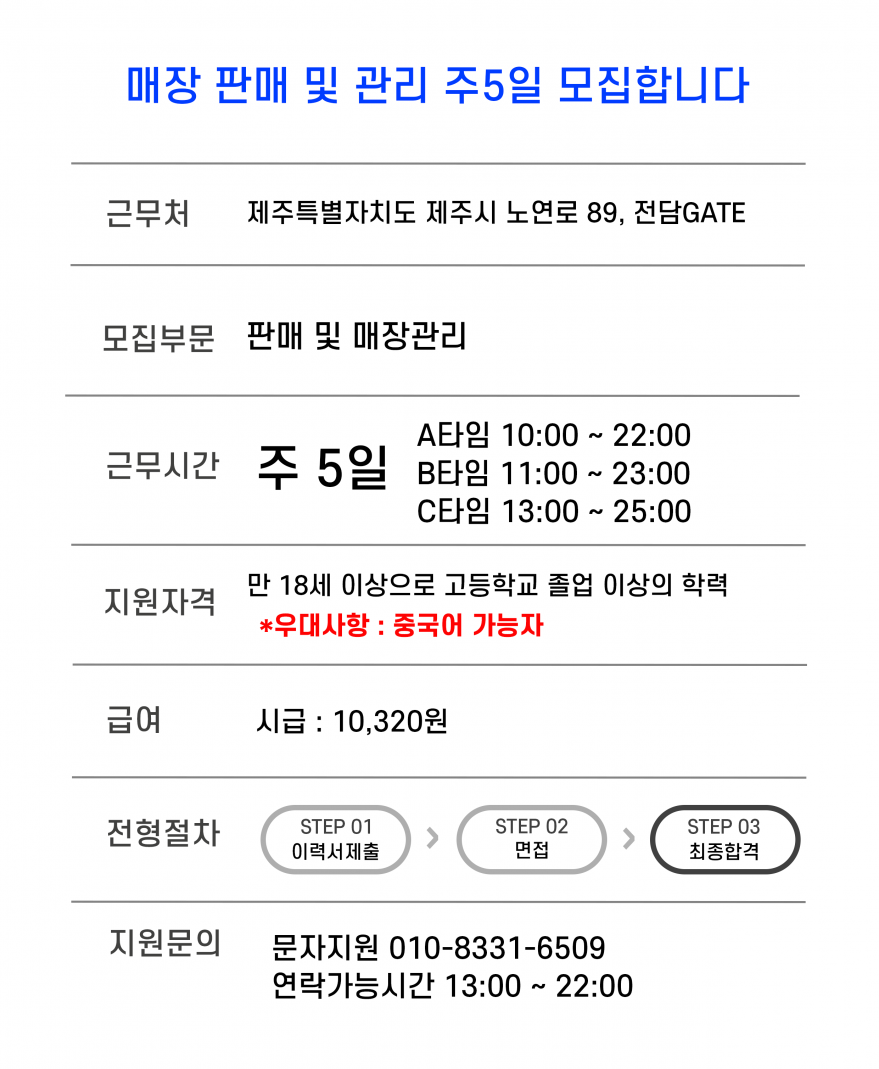 ★★★세상에서 제일 쉬운 판매직 직원을 모집합니다★★★ 페이지 정보 작성자 곽O식 작성일25-12-09 18:41 조회166회 연락처 010-8331-6509 급여 시급 : 10,320 관련링크 본문 ■ 주업무 : 고객이 물건 선택하면 결제 후 봉투에 담아드리기.외워야 할 내용 거의 없음.■ 근무지 : 연동 주소 : 제주특별자치도 제주시 노연로 89 1층 전담GATE 이전글 다음글 목록