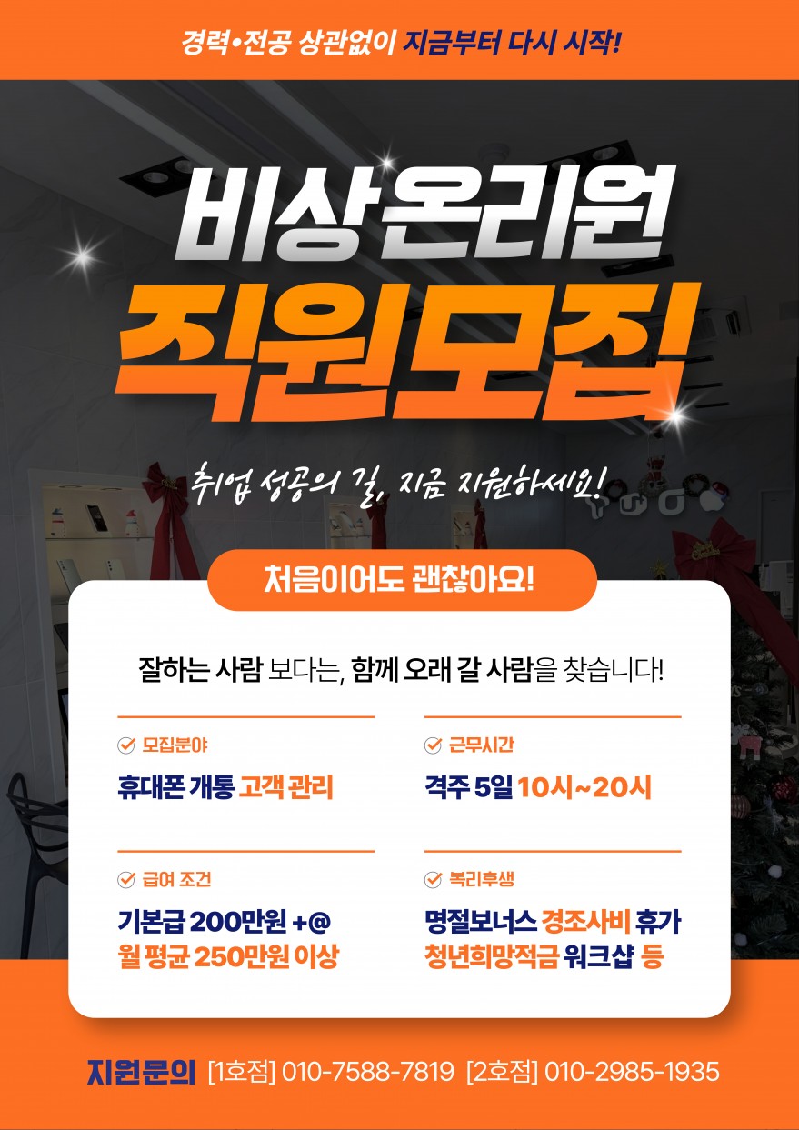 통신3사휴대폰매장⭐️비상!OnlyOne⭐️직원급구!!! 페이지 정보 작성자 아O라 작성일25-12-29 16:07 조회60회 연락처 010-7588-7819 급여 월급 : 250만원 이상 관련링크 본문 - 주소 : 제주 제주시 월랑로 8길 1 이전글 다음글 목록