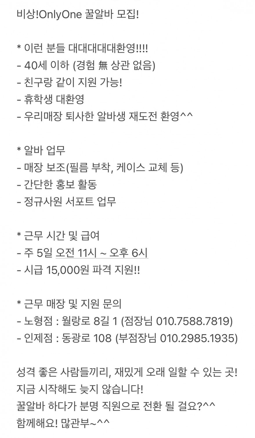 주5일근무/시급15,000원/꿀알바모집/휴학생환영^^ 페이지 정보 작성자 아O라 작성일25-10-22 16:42 조회358회 연락처 010-7588-7819 급여 시급 : 15,000원 관련링크 본문 - 주소 : 제주 제주시 월랑로 8길1 이전글 다음글 목록