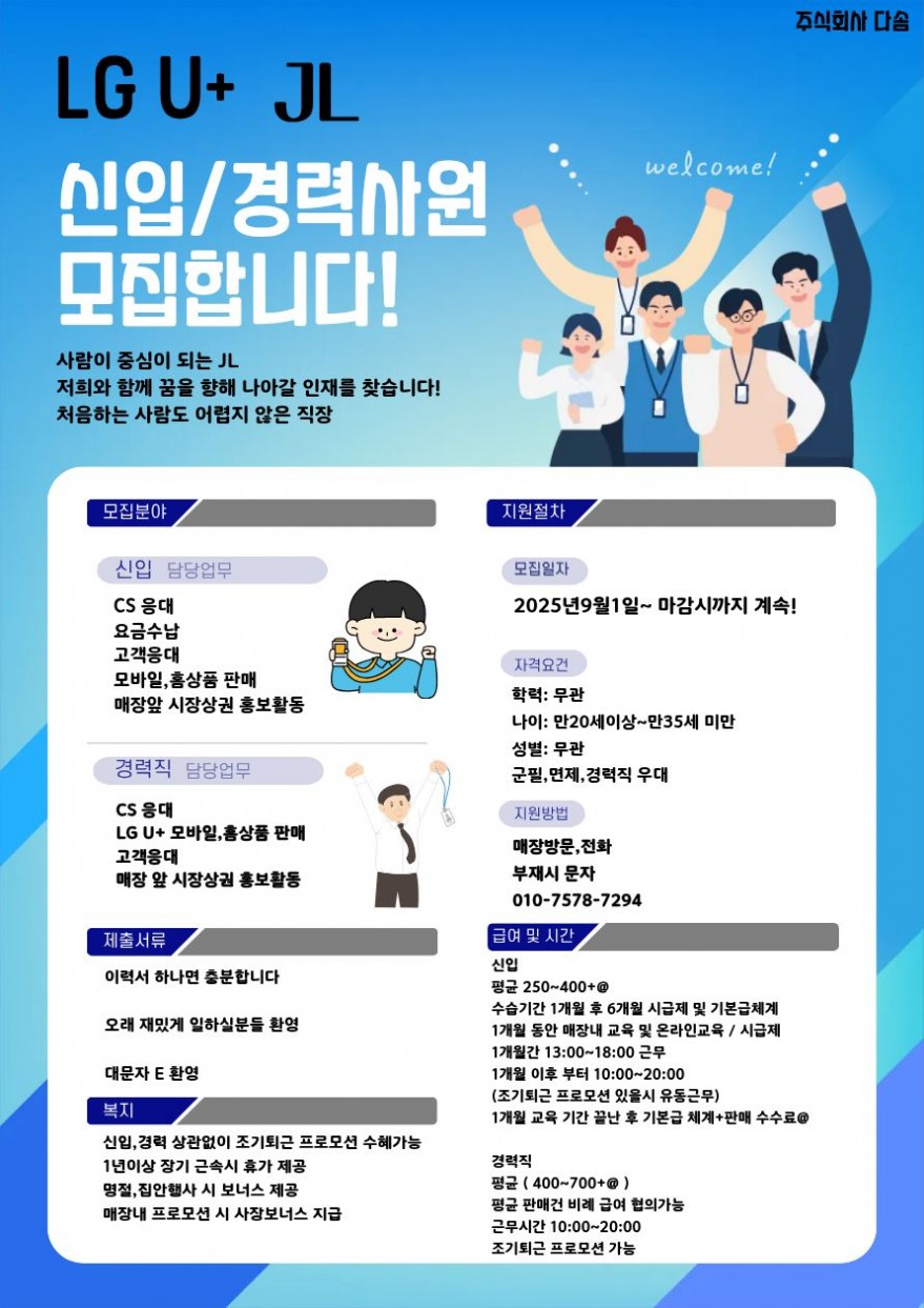 JL 에서 신입직원 및 경력자 구합니다!! 페이지 정보 작성자 제OOOO니 작성일25-11-26 12:13 조회171회 연락처 010-7578-7294 급여 월급 : 350만+@ 관련링크 본문 주소 : 제주특별자치도 제주시 중앙로 76 1층 엘지유플러스 이전글 다음글 목록