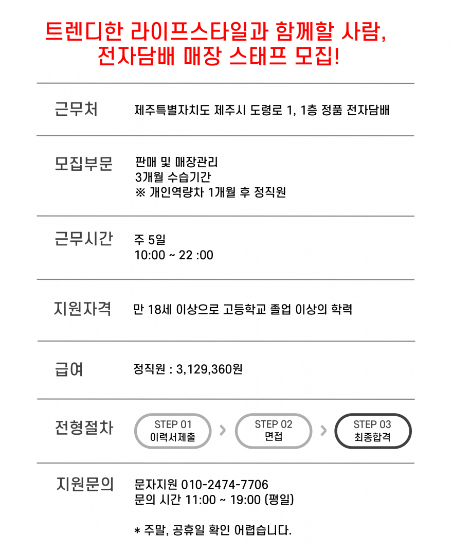 ♥♥ 내일출근하기 딱 좋은 직장 ㅡ 전자담배 전문점 직원구함♥♥ 페이지 정보 작성자 아OOO우 작성일25-11-26 18:03 조회90회 연락처 010-2474-7706 급여 월급 : 3,129,360 관련링크 본문 부재 시 문자로 이력서 보내주세요부재 시 문자로 이력서 보내주세요 주소 : 제주특별자치도 제주시 도령로 1 1층 전자담배 이전글 다음글 목록