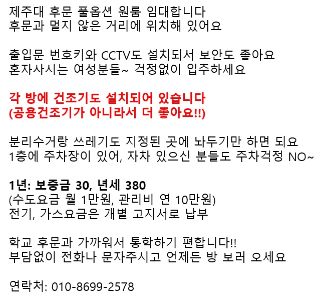 원룸/투룸/쓰리룸 | 제주대학_후문_원룸임대 페이지 정보 작성자 제OOO문 작성일26-01-27 00:13 조회13회 연락처 010-8699-2578 관련링크 본문 주소 : 산천단동 1길 18 청솔원룸 다음글 목록