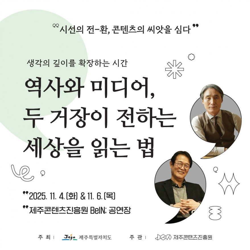 [제주콘텐츠진흥원]역사와미디어,두거장이전하는세상읽는법!(~11/5,수) 페이지 정보 작성자 함OO면 작성일25-10-24 12:37 조회1,141회 연락처 010-1234-5678 관련링크 본문 신청바로가기 자세히보기 이전글 다음글 목록