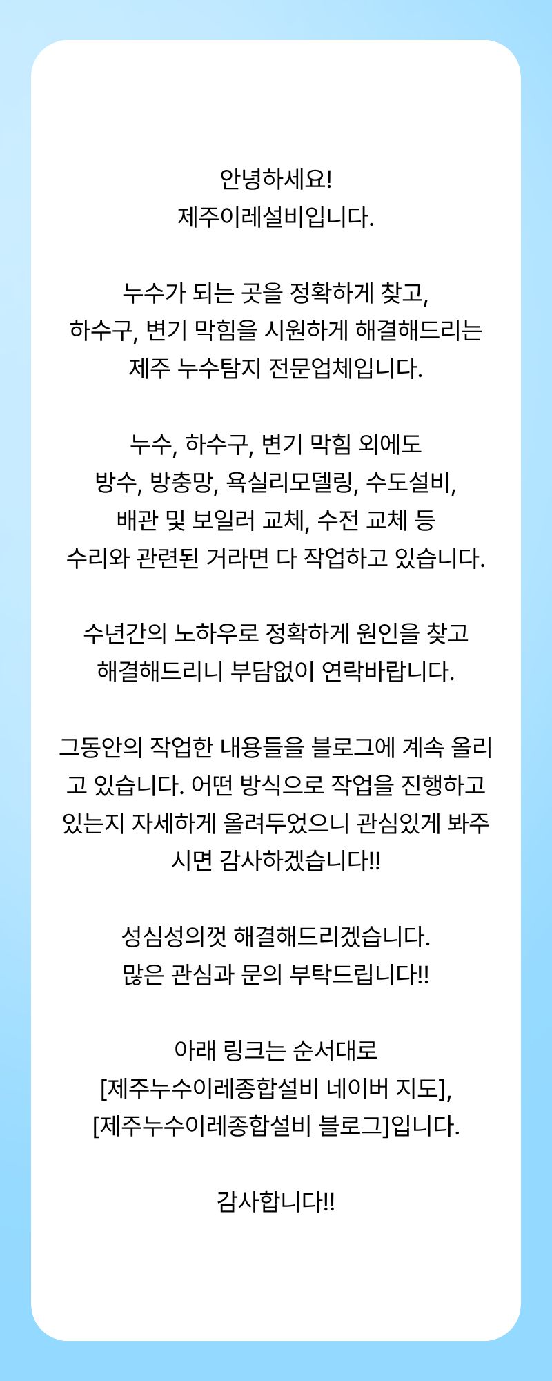 제주이레설비입니다. 페이지 정보 작성자 제OOOO비 작성일25-12-16 20:23 조회194회 연락처 010-3955-7946 관련링크 본문 안녕하세요!제주이레설비입니다. naver.me/Gn0SEyoh blog.naver.com/jeju_jireh 이전글 다음글 목록