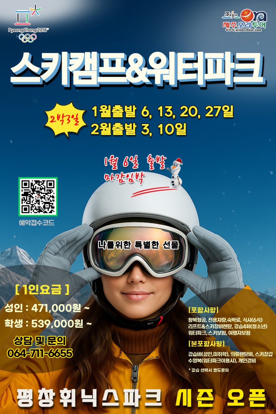 제주오라투어진행2026년월매주화요일출발/스키기초강습/워터파크이용